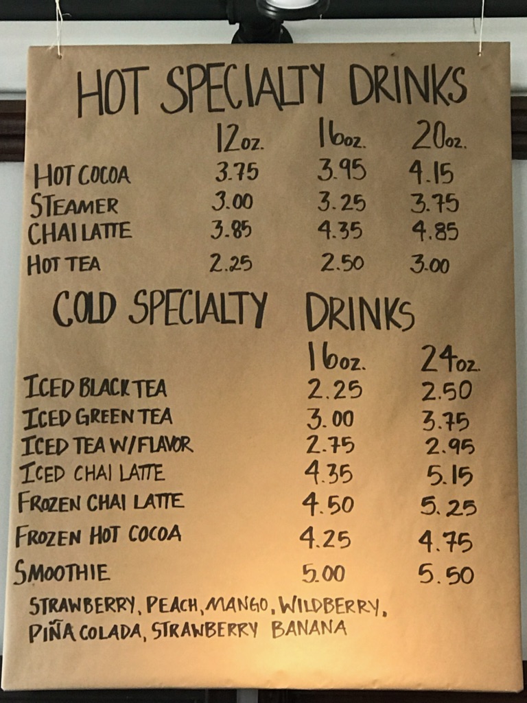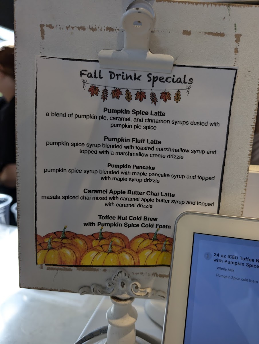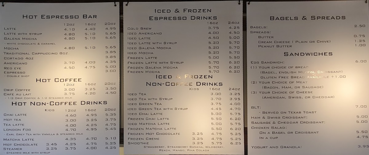 The drink selection focuses on classic espresso-based favorites with a twist—from smooth Mocha Lattes and Pumpkin Spicy Lattes to iced options like the Toffee Nut Cold Brew. These beverages pair well with a variety of casual food choices, such as freshly baked muffins, cinnamon rolls, or savory items like the BLT on bread or bagel sandwiches.